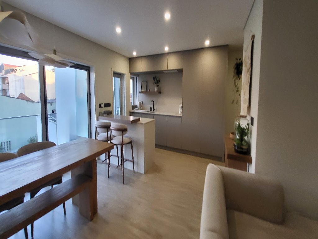 Espetacular T2 Duplex transformado em T1, este imóvel apresenta na zona social, uma sala e cozinha em open-space, lavandaria independente e WC de serviço, Varanda, cozinha equipada com placa de indução, micro-ondas, forno, maquina lavar loiça, combinado, agua aquecida por bomba de calor, acabamentos de excelência, piso em flutuante vinílico, ar condicionado, pré instalação de aspiração central;
